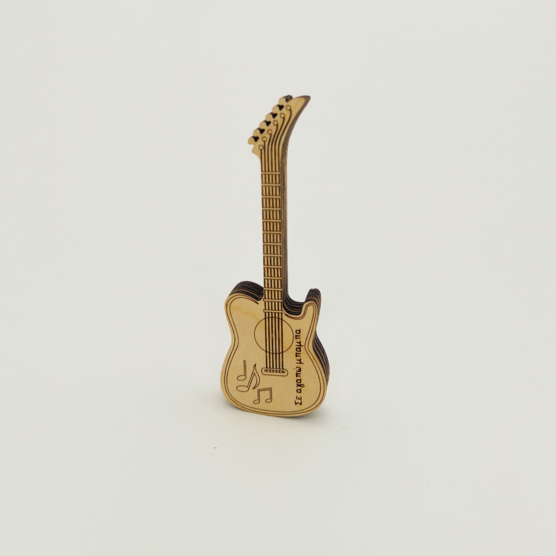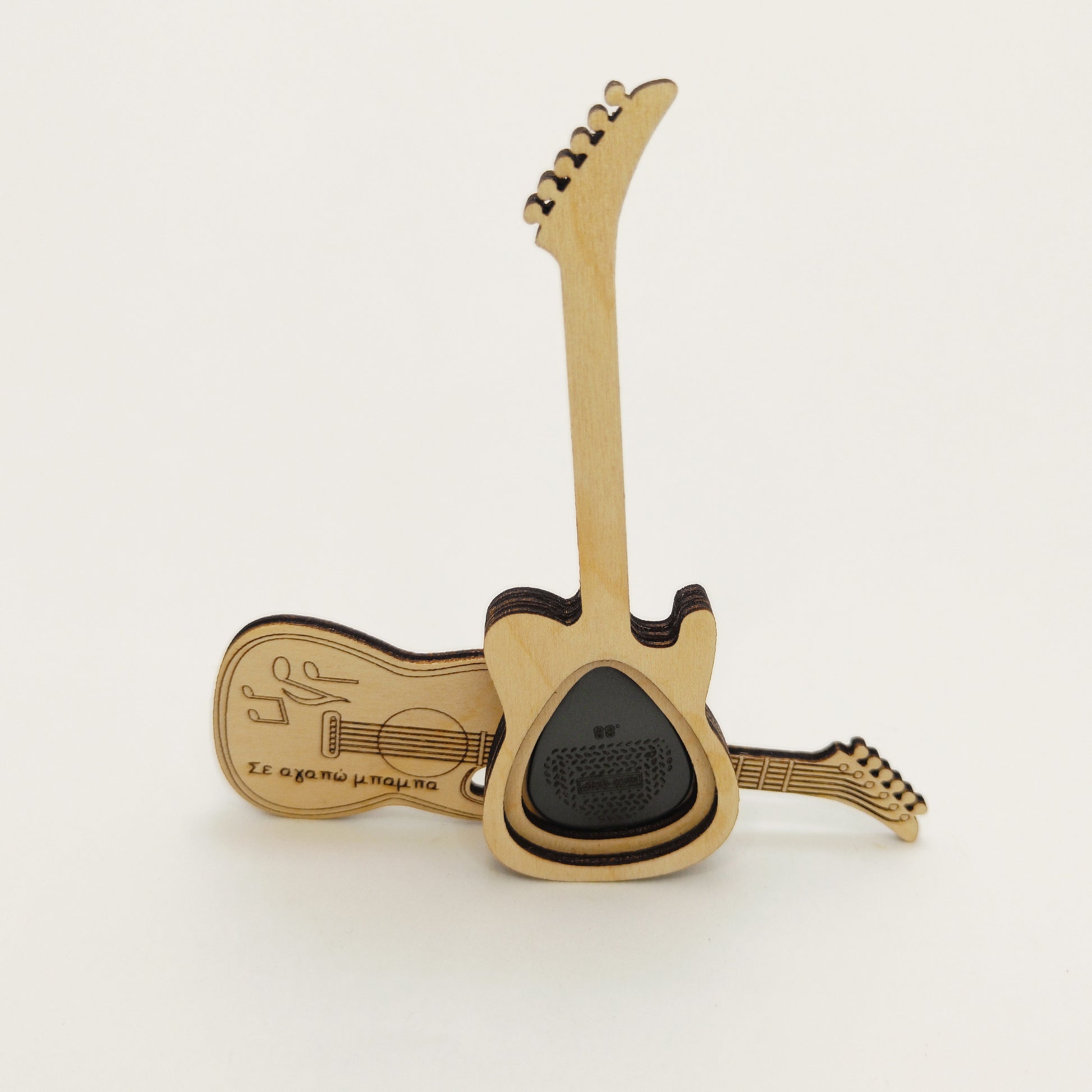 Χειροποίητη ξύλινη θήκη για πένα κιθάρας, με μοναδικό σχέδιο κιθάρας και χαραγμένο μήνυμα αγάπης. Ιδανικό και συγκινητικό δώρο για την Ημέρα του Πατέρα – συνδυάζει στυλ και συναίσθημα σε ένα μικρό, πρακτικό αναμνηστικό.