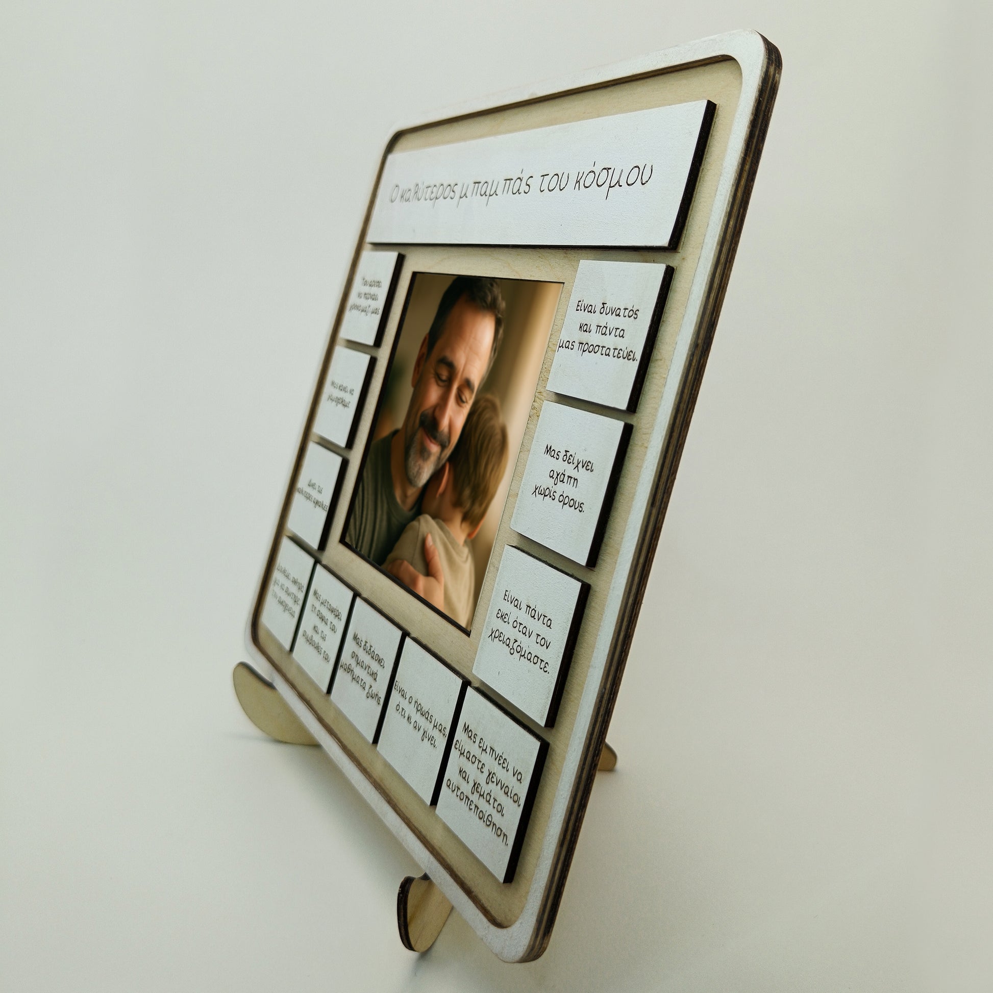 Με ξύλινη αισθητική και διαστάσεις 20x20 εκ., το καδράκι διαθέτει χώρο για φωτογραφία και είναι διακοσμημένο με τρυφερές φράσεις που περιγράφουν όλα όσα αγαπάμε σ’ εκείνον — τη σοφία του, τις αγκαλιές του, την υποστήριξή του.